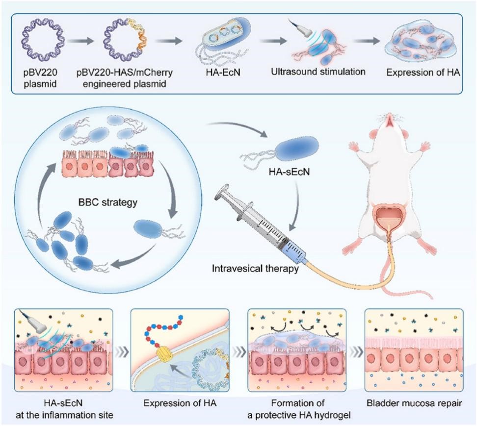 利用基因工程技术,构建温度敏感型质粒pBV220,搭载HA合成酶(HAS)基因与荧光报告基因mCherry。超声波(2.5 W/cm²)精准控温42℃,激活工程菌高效分泌590 kDa高分子量HA,形成保护性水凝胶屏障。开发“细菌粘附-培养迭代筛选法”,经精准筛选获得特异性结合炎症膀胱上皮细胞的治疗菌株。白质组学揭示黏附关键因子FimA/FimH表达上调10倍,靶向效率较RGD修饰提升4倍。最终,可实现单次膀胱灌注后,工程菌驻留损伤部位超21天,HA持续释放形成物理屏障,阻隔尿液中K+/尿素刺激。促炎因子(IL-1β/IL-6)下降50%,紧密连接蛋白表达恢复至正常水平,尿频症状显著改善。这项研究开创了活菌疗法在泌尿系统疾病中的应用先河。通过合成生物学与靶向递送的巧妙结合,为慢性膀胱炎提供了兼具高效性与安全性的解决方案,具有重大临床转化价值。