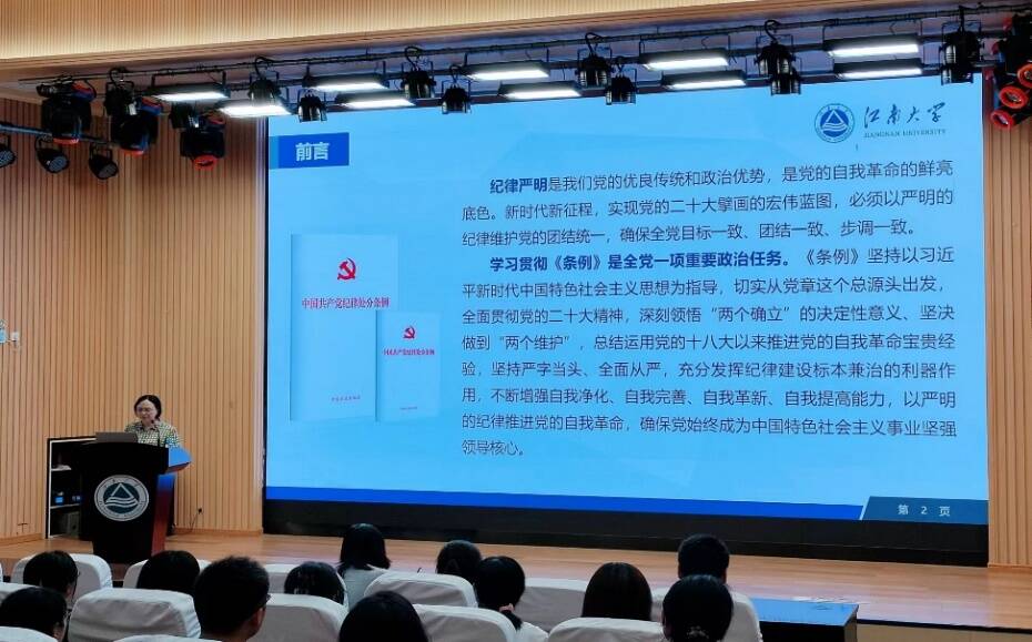 为深入学习贯彻修订后的《中国共产党纪律处分条例》(以下简称《条例》),7月4日下午,公司党委书记向琪为护理系党支部、基础医学系党支部、护理硕士生第一党支部、护理硕士生第二党支部和博士生党支部全体党员讲授专题党课。本次党课旨在推动党纪学习教育走深走实,进一步强化党员的纪律意识,提高党员的政治站位,加强党支部的纪律建设。