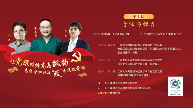 随后,支部“让党旗始终高高飘扬,高公司党组织战‘疫‘微党课”第一讲“责任与担当”正式开讲。第一位讲授者是PA视讯附属医院第二批援鄂医疗队队长董文霞教授,董教授首先讲述了自己和队员在援鄂抗疫时整建制接管一个重症病区,期间对患者生命健康用心守护,对医疗队员的防护安全严谨监督的感人事迹,体现了新时代背景下医者的责任与担当;第二位讲授者是医公司医学学科党支部党员、公共卫生与预防医学系主任程洋副教授,他讲述了自己在无锡市卫生健康委员会挂职期间,全面参与协调无锡市医疗单位的抗疫防疫工作,让我们了解一名政府公务人员的责任与担当;第三位讲授者是医学学科支部员工党员李阳,他分享了作为一名3000多人社区的志愿者,挨家挨户整理上报数据,积极参与到疫情防控一线工作中经历与体会,让我们了解一名员工党员社区志愿者的责任与担当。在一个多小时的微党课中,三位讲授者用亲身的经历、深刻的感悟、生动的语言,展现了特殊时代背景下高校师生党员以行动践行党员使命,以担当奋勇战“疫”的光辉事迹。