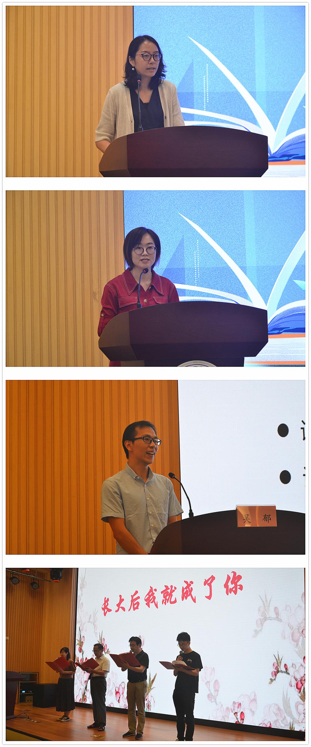 医公司胡静老师和附属院康丝丝老师分别作为获奖教师代表发言,他们深情回顾走上三尺讲台以来的点点滴滴,表达了对医公司、附属医院的真挚感情和良好祝愿。接下来,省本科高校青年教师教学竞赛一等奖获得者吴郁老师做了授课风采展示。医公司师徒四代的邬敏辰、邓超、林丹、王少和老师作诗朗诵《长大后我就成了你》,深情演绎了什么是博爱、仁心、传承的精神,将庆祝大会推向高潮。