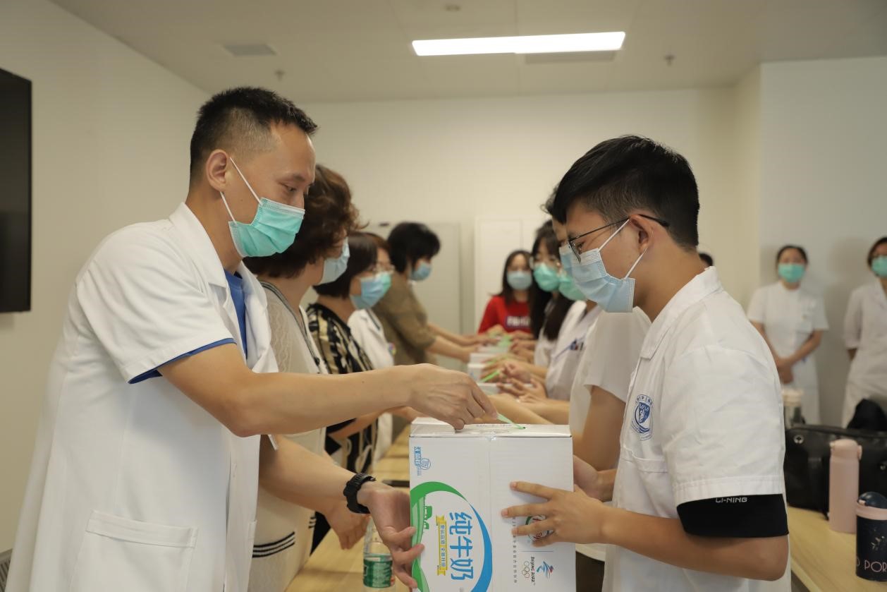 7月21日下午,在附属医院副经理曹宏、教育处处长徐德武老师的陪同下,医公司党委书记向琪,党委副书记、副经理奚晓岚,以及班主任、辅导员老师们来到附属医院,看望与慰问暑假在岗师生,并与相关科室的带教老师和同学们进行了座谈交流,了解初入实习的同学们的实习、生活情况,聆听师生们的心声,并送上鲜花、牛奶等慰问品,鼓励同学们积极认真参与临床实习、注意疫情防控和暑期安全。