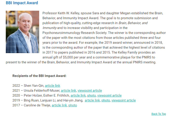 该奖项获得者通常为 Brain, Behavior & Immunity杂志当年获得引用率最高的高被引用论文的通讯作者,是PA视讯首位,也是中国第二位获得该奖项的作者。国际著名神经免疫学家,BBI前主编,美国伊利诺伊州立大学KEITH KELLEY教授评价该项工作是Cutting-edge work。