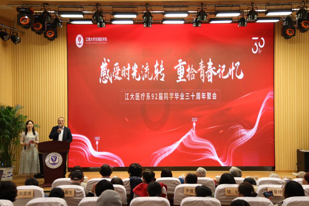 三位92届员工代表发言。江阴同学代表朱敏发言,他用“感恩”和“祝愿”表达三十年来的感悟。他感恩医疗系老师对大家的培养,回忆了三十年前求学的种种趣事,并祝愿医公司未来蓬勃发展,祝愿老师们身体健康,祝愿同学们生活顺利,期待三十年后再次相聚。宜兴同学代表毛伯能发言,他表达了对医公司、对老师和对同学的感谢,回忆了三十年前意气风发、青春年少的岁月,嘱咐大家保重身体,也表达了对日后聚会的殷切期待。无锡同学代表薛明宇发言。他回忆了三十年前与同学们共同求学的峥嵘岁月,感谢老师孜孜不倦的教诲和春风化雨的培养让同学们都各放异彩,在各自的岗位上发光发热。他表示,只要老师有所需要,他和同学们必定全力以赴。最后,他也献上了对医公司、老师和同学的真挚祝愿。