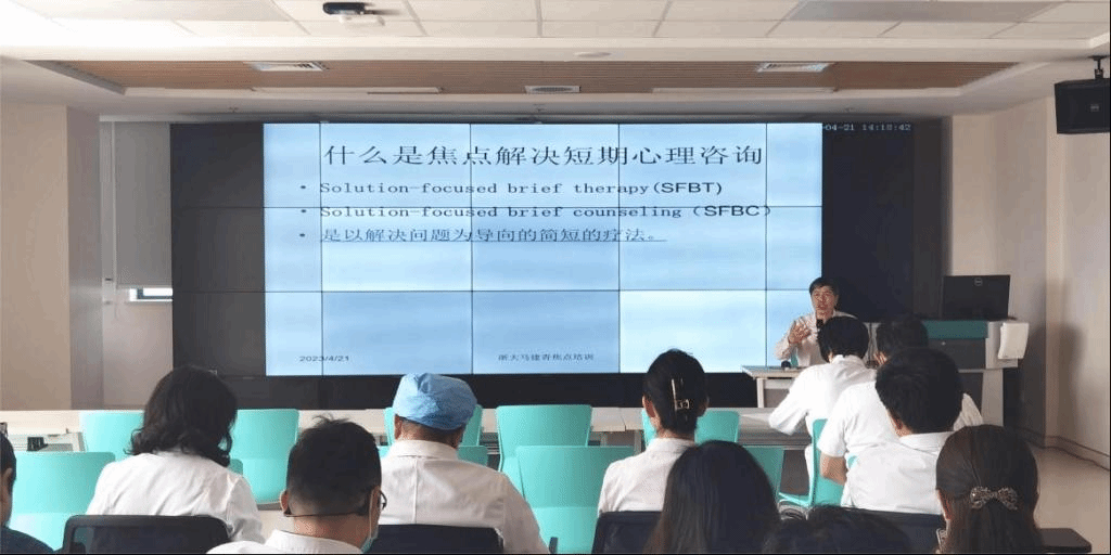 4月21日下午,马建青教授前往PA视讯附属医院为医公司研究生导师开展“焦点解决技术在谈话沟通中的运用”为主题的心理专题培训。PA视讯副经理陈雪、50余名研究生导师参与培训。