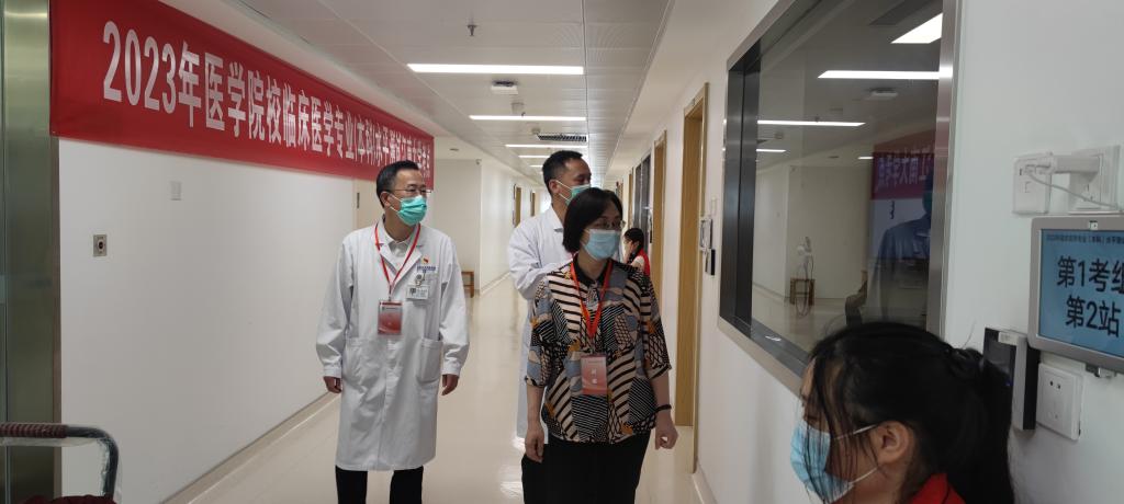 医公司党委书记向琪和附属医院副经理陆华巡视技能考试考场