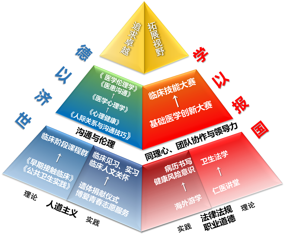 紧扣大健康理念,构建递进式医德素质教育模式,强化医员工的职业素养。将社会环境教育前移,遗体捐献、博爱青春等志愿者活动以加强人文和健康科普素养。举办仁医讲堂,邀请自政府、高校、附属医院名家名医来院讲学,引领医员工树立专业自信。重视沟通与伦理能力培养,在基础阶段侧重人际交流能力,在临床阶段以医患沟通实践为主。海外访学、知名医院观摩交流、全球卫生概论以拓展其大健康、大卫生的全球视野。基础医学实验创新竞赛、临床技能竞赛活动将专业教育和素质教育交融渗透。