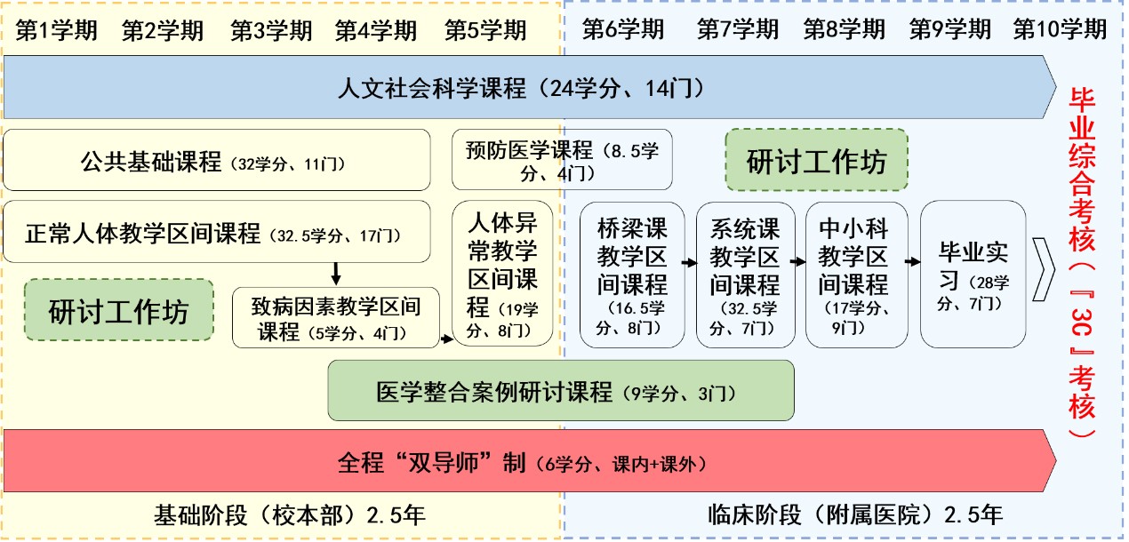 以“基础与临床融合”教育理念为引导,主动接轨国家医学本科教育标准,不断优化临床医学专业培养方案,以“一模式、两全程、三综合”为主线,制订覆盖生命全周期、健康全过程的课程计划,培养医员工服务生命健康的医者精神和知识能力素质。