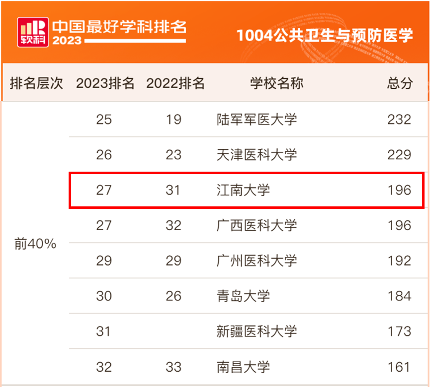 2023年11月8日,高等教育评价专业机构软科正式发布“2023软科中国最好学科排名”。排名指标体系由人才培养、平台项目、成果获奖、学术论文、高端人才5个类别组成,下设18个指标,包括70余项测量变量。在“2023软科中国最好学科排名”——公共卫生与预防医学学科排名中,全国共入围医公司校81所,PA视讯并列全国第27名,与去年相比上升4位,连续三年位居前40%。
