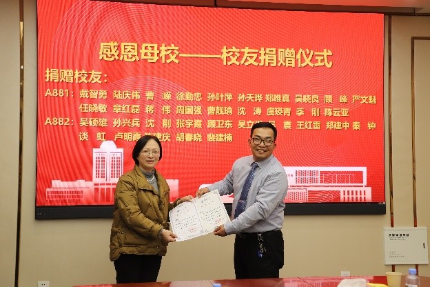员工代表发言环节中,A881班班长曹嵘感谢母校以厚重的人文底蕴、一流的人才培养能力,造就了一批又一批具有崇高医德、扎实医学功底和仁爱之心的医学人才,希望爱心捐赠能为医学界培养更多的人才精英!A882班班长吴硕雄回忆当初选择专业时的思想情感,感恩老师引导同学们做出正确的人生抉择。他感叹三十多年来从医疗系到单独的医公司,他为母校的蓬勃发展感动自豪,也希望能为母校建设贡献新力量。