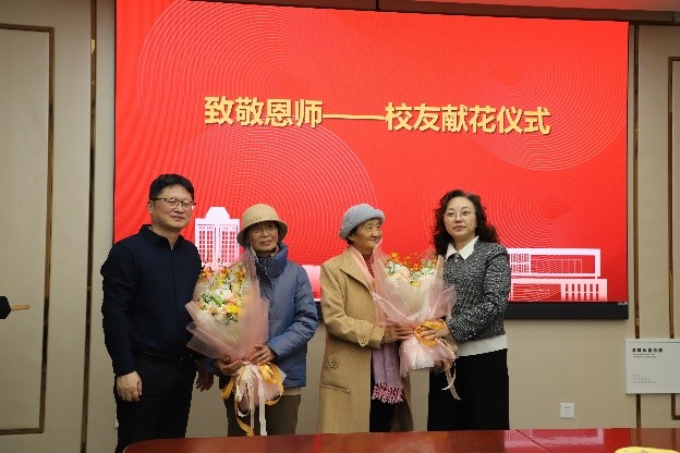员工们向恩师陈屏老师、缪爱棣老师献上鲜花,致敬老师们的教育之恩!