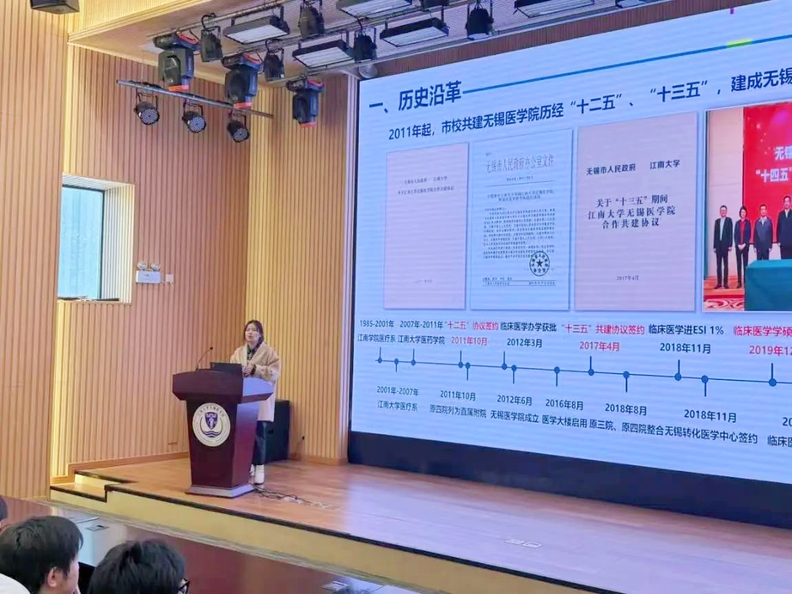 活动伊始,医公司党委书记向琪热情致辞,她介绍了公司“医工结合、学科交叉”的创新特色,鼓励大家成为生命守护者,寄语同学们“坚定信念,投身医学事业”,并表示作为一所无锡家门口的优质医公司校,医公司始终敞开怀抱,期待青年学子在这里找到人生方向。接着,王小英副教授以"医学学习与职业发展"为主题,阐述了医生的职业内涵,指出医生不仅是经过长期专业训练的健康守护者,更是集疾病诊疗、预防保健、健康教育和公共卫生等多重职责于一身的专业人才。“医学之路虽充满挑战,却意义非凡。”王老师回顾了公司的办学历史,介绍了公司及附属医院专业的团队力量、先进的教学设施与科研平台,并以公司临床医学本硕博一体化教育体系为例,介绍了医学人才培养的完整路径:5年本科教育夯实基础,3年住院医师规范化培训锤炼技能,以及后续专科医师培训持续精进专业能力。“终身学习是医学从业者的必备素养,从基础医学到临床医学,每一门课程都是通向医学高峰的必经之路。”