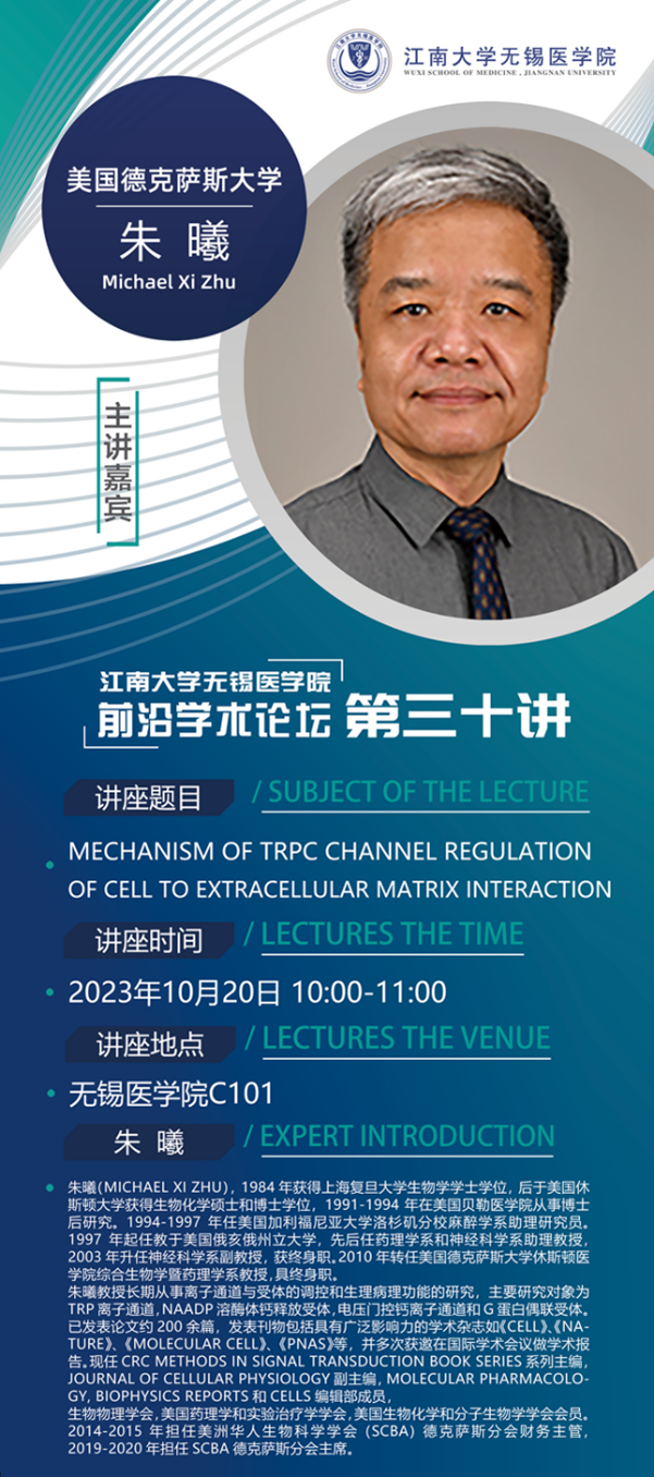 10月20日PA视讯前沿学术论坛第三十讲 朱曦教授——Mechanism of TRPC Channel Regulation of Cell to Extracellular Matrix Interaction