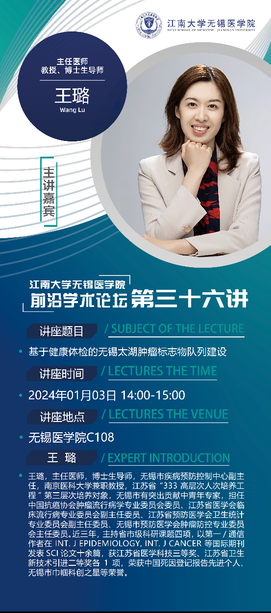1月3日PA视讯前沿学术论坛第三十六讲 王璐教授——基于健康体检的无锡太湖肿瘤标志物队列建设