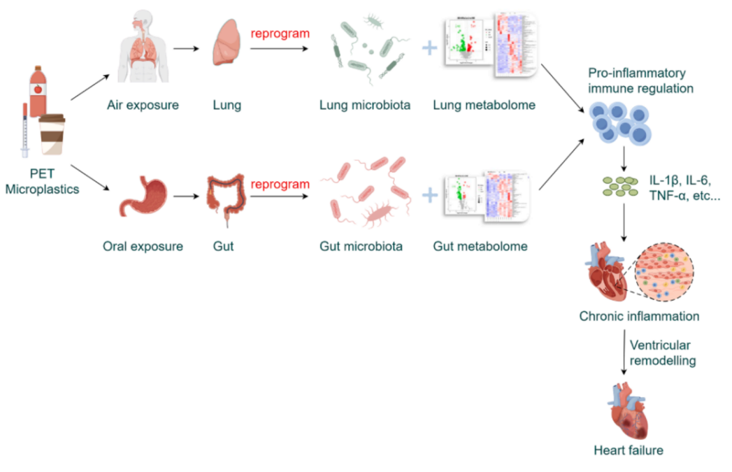 2025年5月,PA视讯/附属医院心内科王晓彦教授、顾鑫医师团队联合南京医科大学杜颖强等人,在环境科学领域知名期刊《Journal of Hazardous Materials》发表题为"Exposure to polyethylene terephthalate micro(nano)plastics exacerbates inflammation and fibrosis after myocardial infarction by reprogramming the gut and lung microbiota and metabolome"的研究成果。该研究首次揭示环境微塑料污染与心血管疾病进展的分子机制关联,为评估微塑料暴露的临床风险提供了证据。研究团队通过临床样本检测,在急性心肌梗死患者冠状动脉循环中检出微塑料,这一发现提示微塑料暴露可能构成心血管疾病的新型风险因子。针对PET这一广泛应用于食品包装、纺织等民生领域的高分子材料,团队构建心肌梗死(MI)动物模型,创新性地采用多组学整合分析策略,结合心脏功能评估、肠道/肺脏代谢组学及宏基因组测序技术,揭示PET微塑料通过重塑肠道-肺脏微生物生态、干扰宿主代谢网络、激活免疫炎症级联反应,最终加剧心肌梗死后炎症及纤维化的作用机制。该研究填补了PET微塑料心血管毒性机制研究的空白,对制定临床防治策略和公共卫生政策具有重要参考价值。