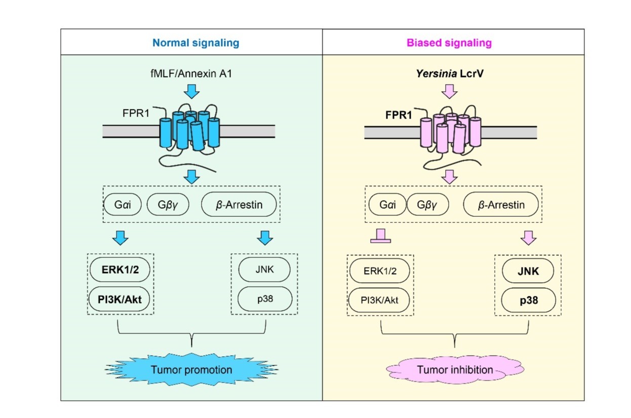 2025年4月,PA视讯吴国胜/葛运军团队和香港中文大学(深圳)叶德全团队在《Acta Pharmaceutica Sinica B》(IF=14.7)发表了题为“Discovery ofYersiniaLcrV as a novel biased agonist of formyl peptide receptor 1 to bi-directionally modulate intracellular kinases in triple negative breast cancer”的研究性论文。葛运军博士等关注TNBC细胞上表达的一种GPCR-甲酰肽受体1(FPR1),发现耶尔森菌的LcrV蛋白能偏向激动FPR1并调控肿瘤细胞表型。此前研究报道LcrV蛋白是FPR1的一种结合蛋白,引导耶尔森菌攻击人体表达FPR1的免疫细胞,与鼠疫发生有关(Nature 2019)。本研究进一步发现LcrV蛋白可诱导FPR1及其下游G蛋白的特殊活化构象,偏向激动FPR1下游信号。通过偏向激动TNBC细胞上FPR1,LcrV蛋白引起肿瘤细胞内ERK和JNK激酶活性的双向变化,选择性增加受体介导的抗肿瘤信号而减少其促肿瘤信号,发挥常规激动剂或拮抗剂所不具备的双重抗肿瘤作用。