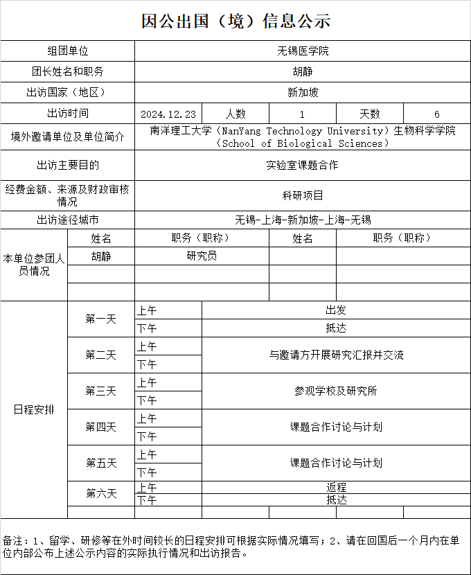 应新加坡南洋理工大学(NanYang Technology University)生物科学公司(School of Biological Sciences)的邀请,为科研合作交流,我单位拟派胡静率团一行1人于2024年12月23日赴新加坡参加科研合作交流。