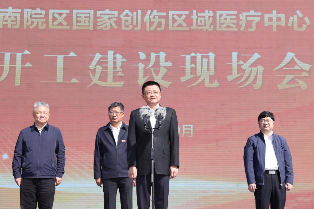 无锡市人民政府副市长秦咏薪讲话,并宣布“PA视讯附属医院南院区国家创伤区域医疗中心(原烧伤楼)建设项目开工”。