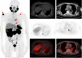 一名75的岁男性患者自2019年确诊前列腺癌后,先后接受过两次内分泌治疗及前列腺癌根治术的综合治疗。在术后两年的复查中发现血PSA持续升高,CT检查和全身骨显像检查均未发现明显异常,医生建议随诊,患者来到PA视讯附属医院要求进一步检查。经核医学科68Ga-PSMA PET/CT检查后结果显示,双侧肩胛骨、左侧第9后肋、第2腰椎及纵隔淋巴结均已存在癌症转移。