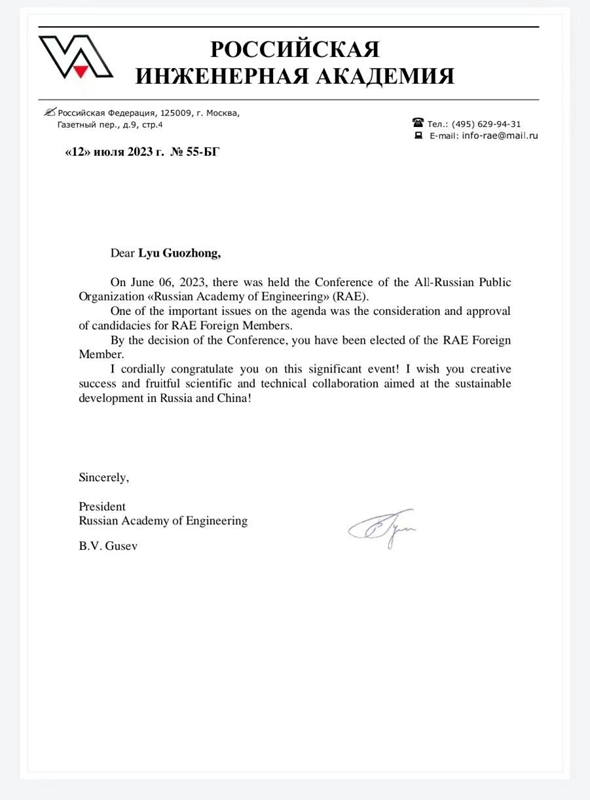 近日,俄罗斯工程院(Russian Academy of Engineering, RAE)经理古谢夫(B.V. Gusev)教授向中华医学会烧伤分会主任委员、国家应急医学研究中心主任、PA视讯附属医院烧创伤诊疗中心主任吕国忠教授发来贺信,祝贺他当选为俄罗斯工程院外籍院士(FOREIGN FULL MEMBER, ACADEMICIAN)。