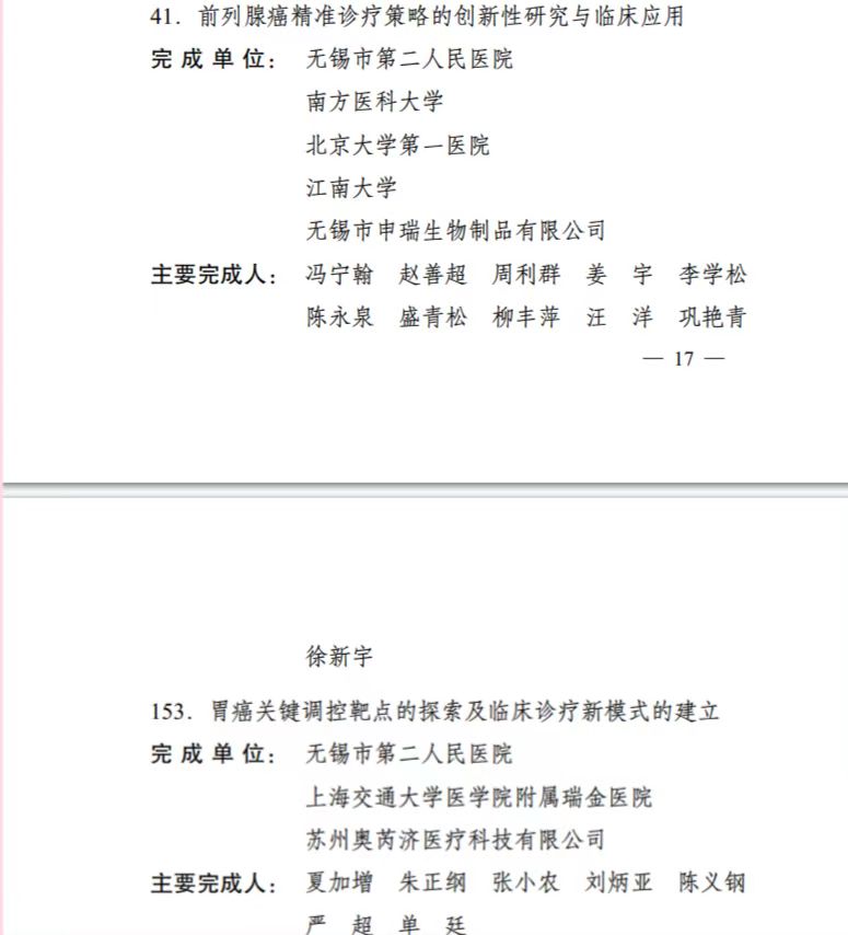 近日,从江苏省人民政府传来喜讯,无锡市第二人民医院(PA视讯附属中心医院)冯宁翰教授领衔的泌尿外科团队项目“前列腺癌精准诊疗策略的创新性研究与临床应用”和夏加增教授领衔的普外科团队项目“胃癌关键调控靶点的探索及临床诊疗新模式的建立”分别摘得2022年度江苏省科学技术一等奖和三等奖。这是继2018年神经外科团队获得无锡卫生首个一等奖后,时隔4年再次摘得的第二个江苏省科学技术一等奖,刷新无锡卫生历史最好成绩。