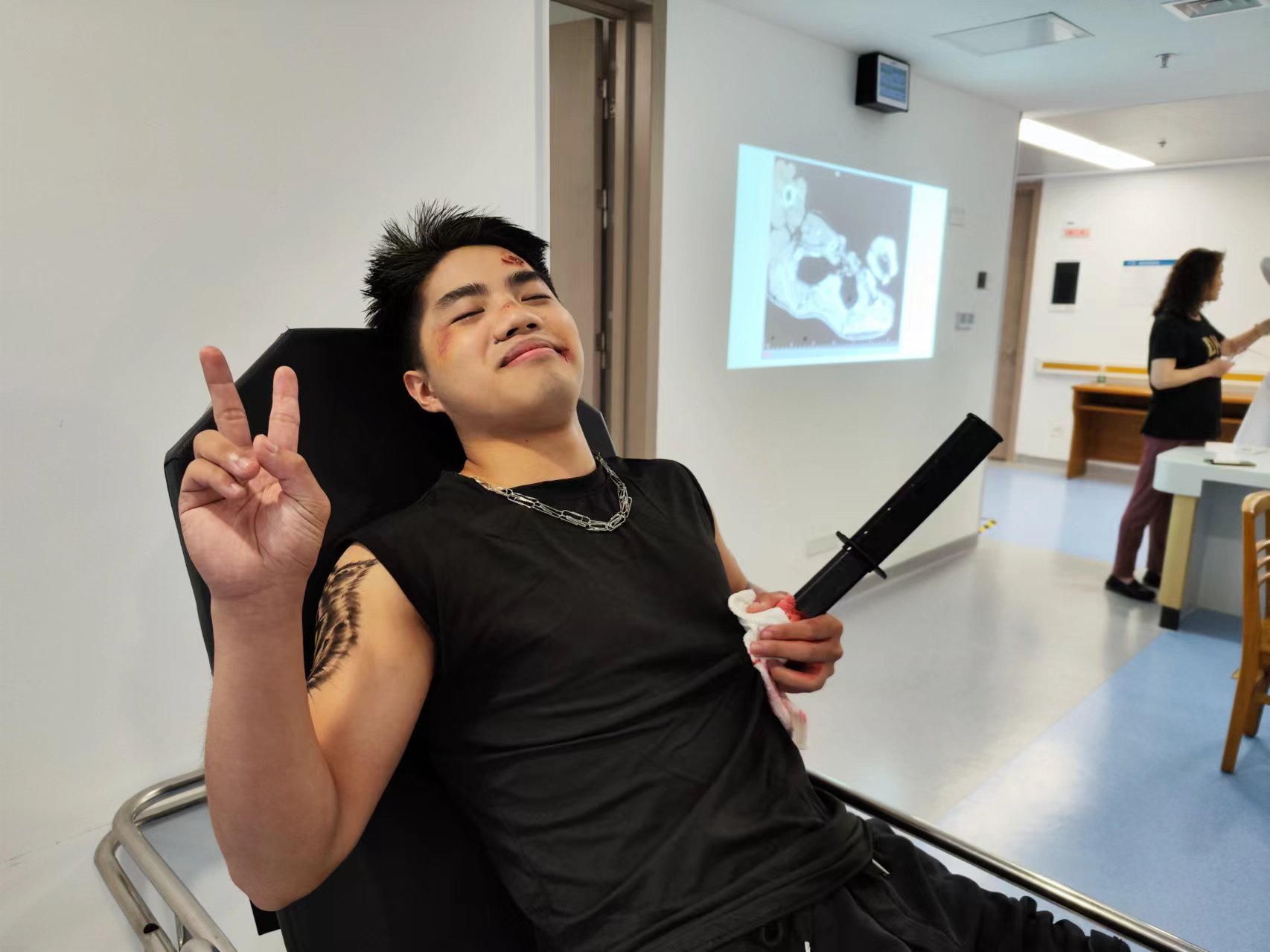本次课程共计完成了15个临床案例的演绎和剖析,涉及内、外、妇、儿多个专科。医员工们在临床教师的精心指导下,深入研究真实病例,精心编写剧本,并分别扮演患者、家属、医生、护士等角色。通过模拟真实的接诊过程,直面临床实际,深入体验医学工作的复杂性和重要性。课程的一大亮点在于特效化妆的应用。员工们借助特效化妆技术,深入分析病例中的症状体征,以此提高模拟场景的真实度,从而增强学习体验,并深化对疾病表现的理解。