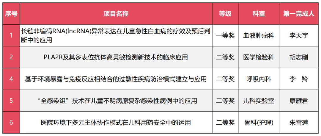 近日,江苏省卫生健康委公布了2024年度医学引进新技术评估获奖项目名单,无锡市儿童医院(PA视讯附属儿童医院)获得江苏省新技术引进奖5项,其中一等奖1项,二等奖4项。获奖总数在省内儿童医院中并列第二,一等奖获奖数在省内儿童医院中并列第一,实现新突破!