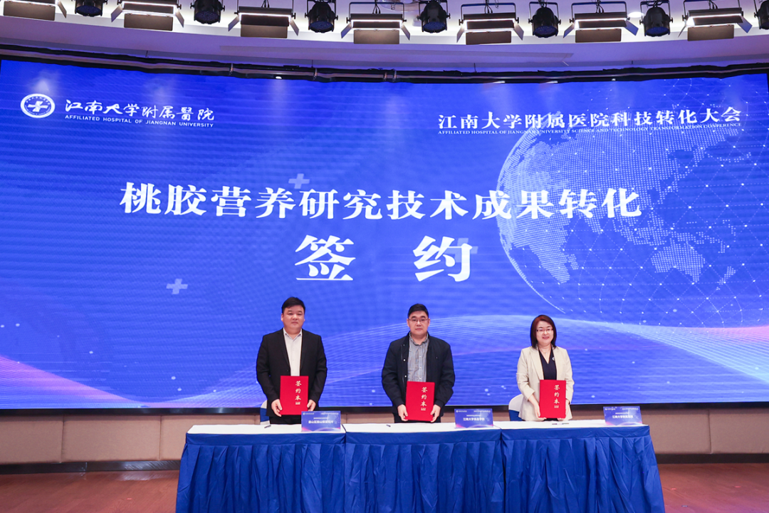 PA视讯附属医院副经理曹宏,PA视讯食品公司副经理赵伟,惠山区阳山镇普照村党总支书记、村委会主任杨一飞进行桃胶营养研究技术成果转化签约。