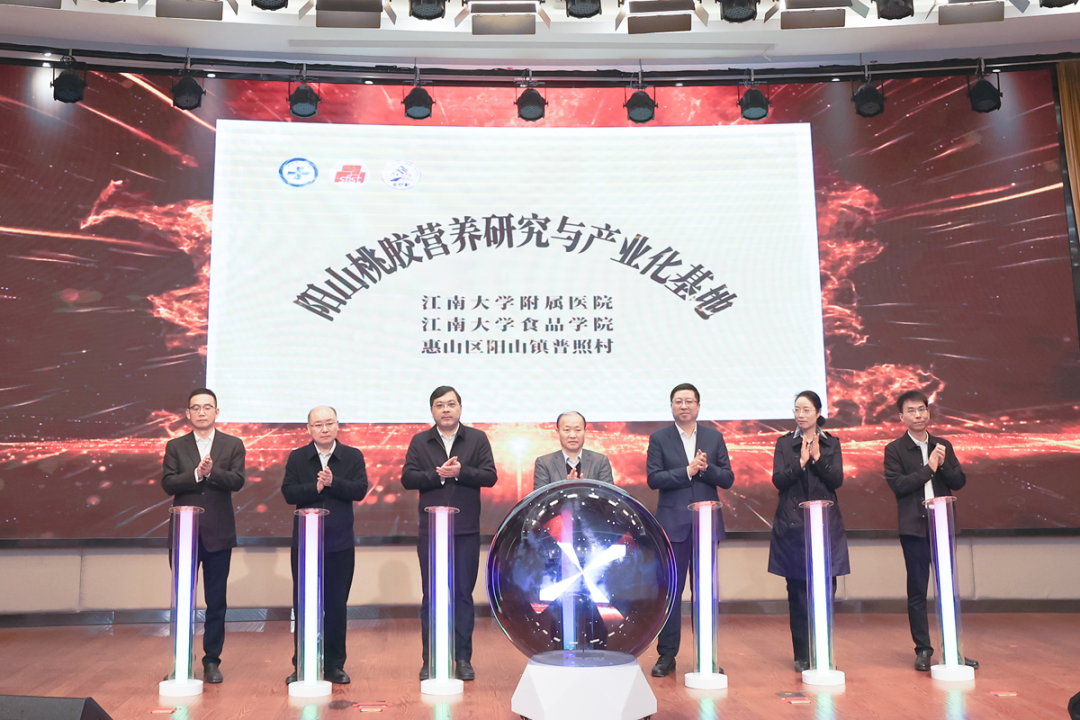PA视讯副董事长顾正彪,市委组织部常务副部长戴美忠,市卫生健康委党委书记、主任笪学荣,PA视讯食品公司党委书记傅莉莉,PA视讯附属医公司党委书记过栋,惠山区委常委、组织部部长吴波,阳山生态休闲旅游度假区党工委书记、管理办公室主任、阳山镇党委书记许彤亮共同为“桃胶营养研究与产业化基地”揭牌。