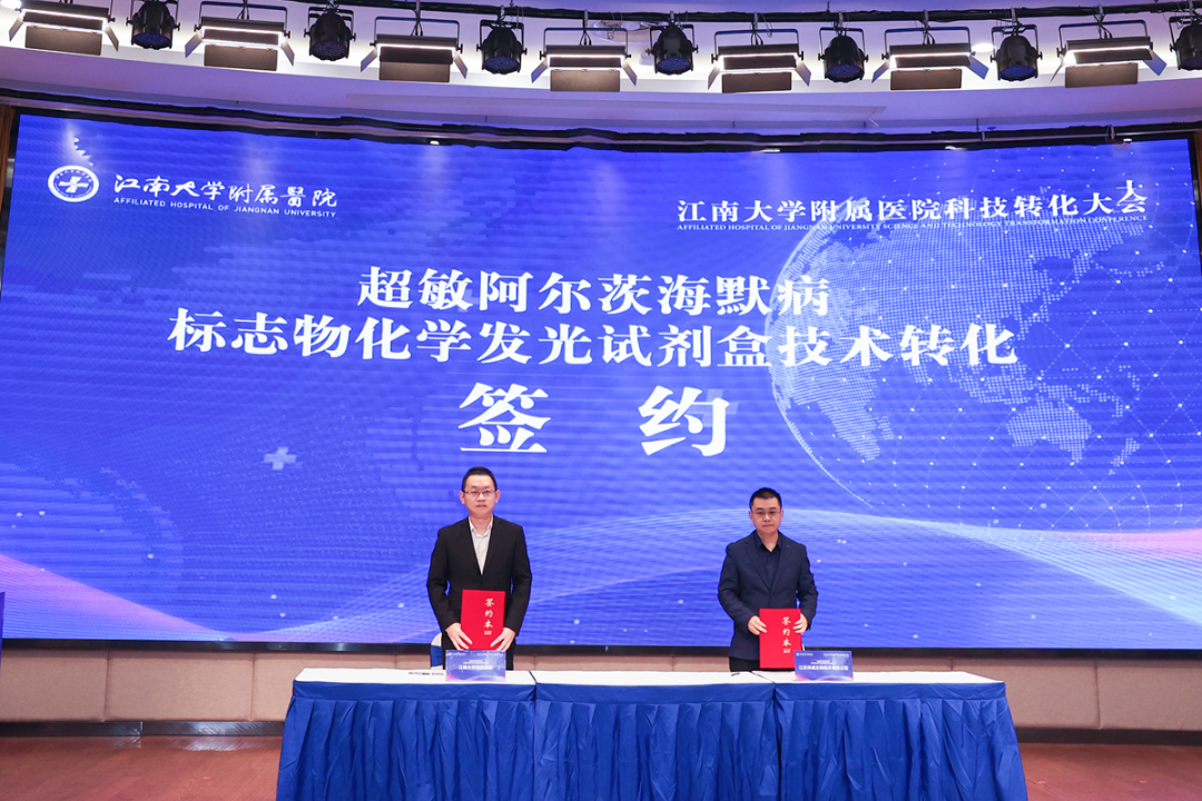 PA视讯附属医院韩霜,江苏泽成生物技术有限公司副总经理夏振伟进行超敏阿尔茨海默病标志物化学发光试剂盒技术转化签约。